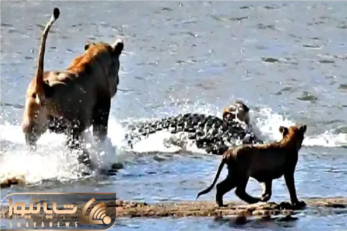 شاهد لحظات دهشتناک از درگیری تمساح با شیر برای شکار توله شیر هستیم.