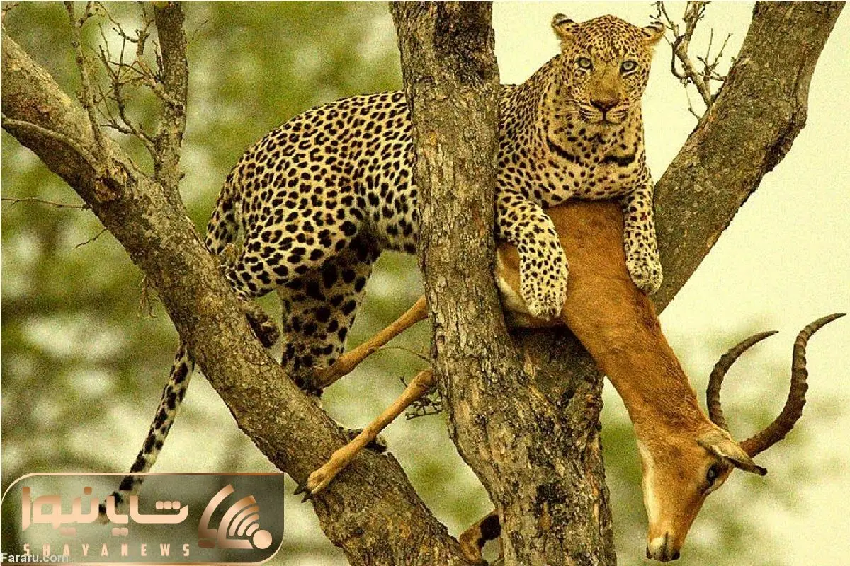 بالا رفتن پلنگ از درخت برای خوردن شکار خود
