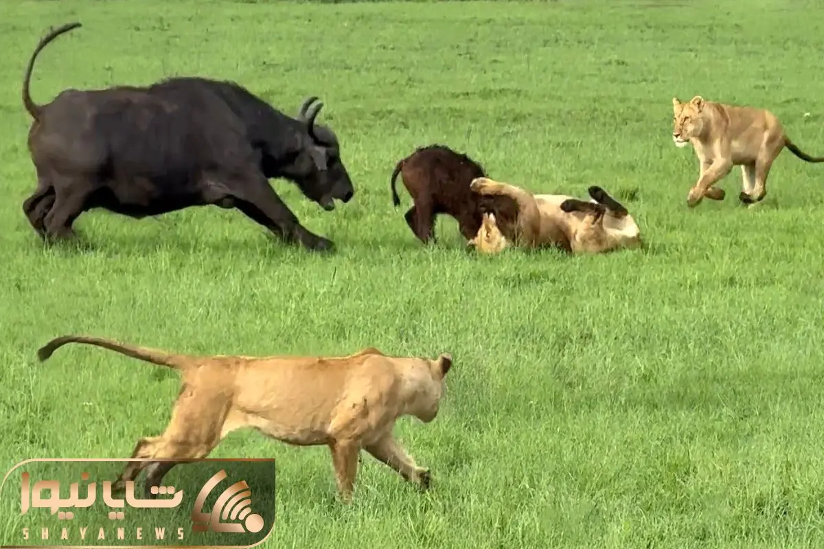 مادر مهربان و گله تمام تلاش خود را میکنند تا بچه بوفالو را از دست شیرها نجات دهند