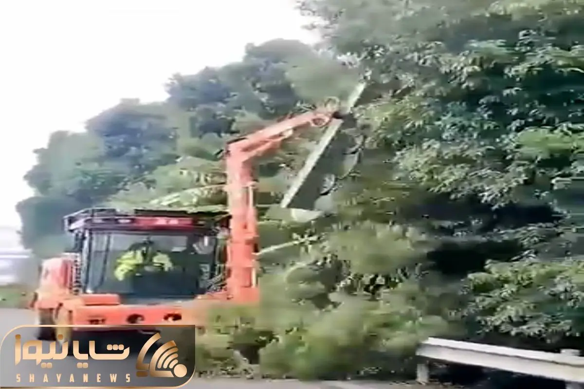شاهد کلیپی جالب از ماشینی هستید که با تیغههایی که داره شاخه درختانی که لب جاده به ماشینهای دیگه برخورد میکنن رو هرس میکنه.