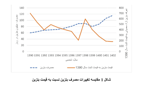 در بنزین، نمودار مقایسه قیمت واقعی و مصرف نشان میدهد هرجا قیمت ثابتشده پایین آمده، مصرف بالا رفته است؛ بهویژه در سالهای اخیر که ارزش واقعی بنزین بهدلیل تورم سقوط کرده و شیب افزایش مصرف تندتر شده است.